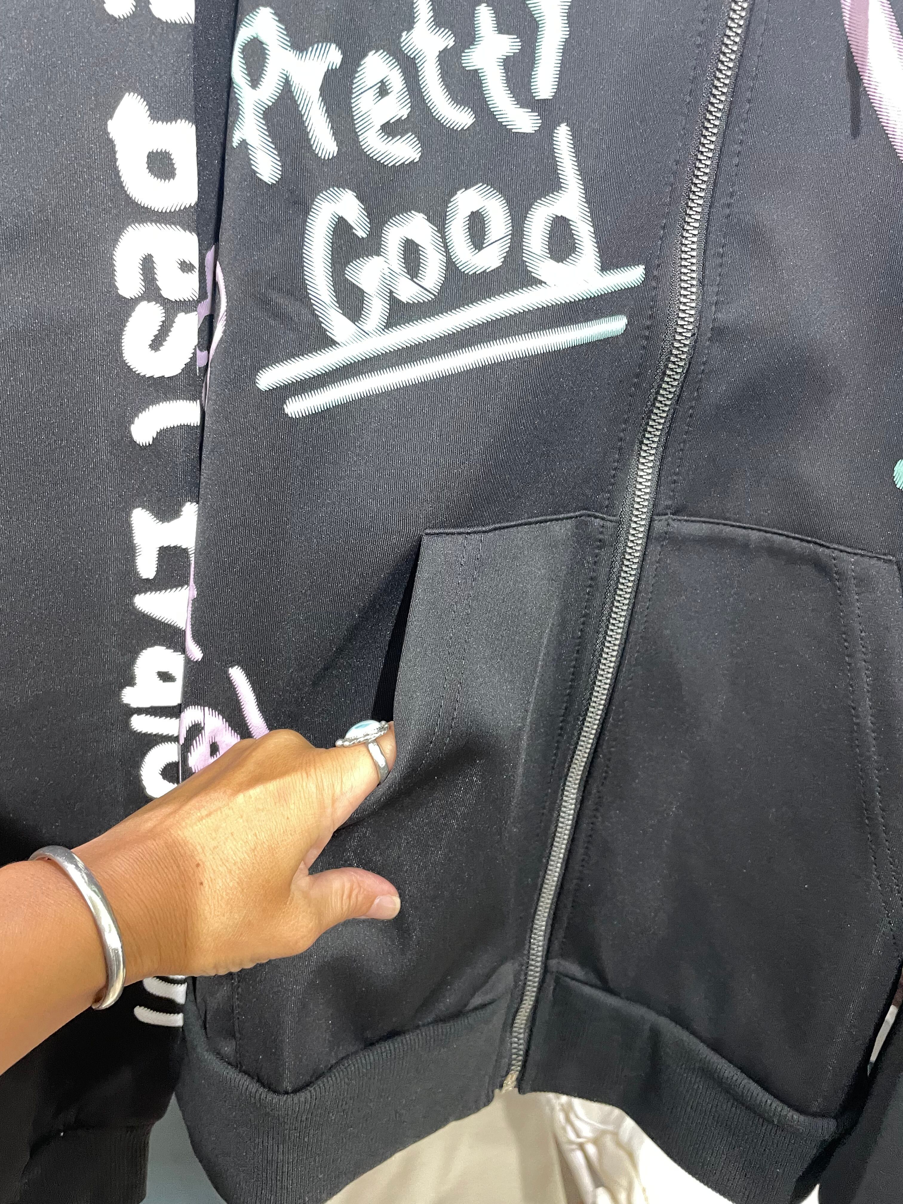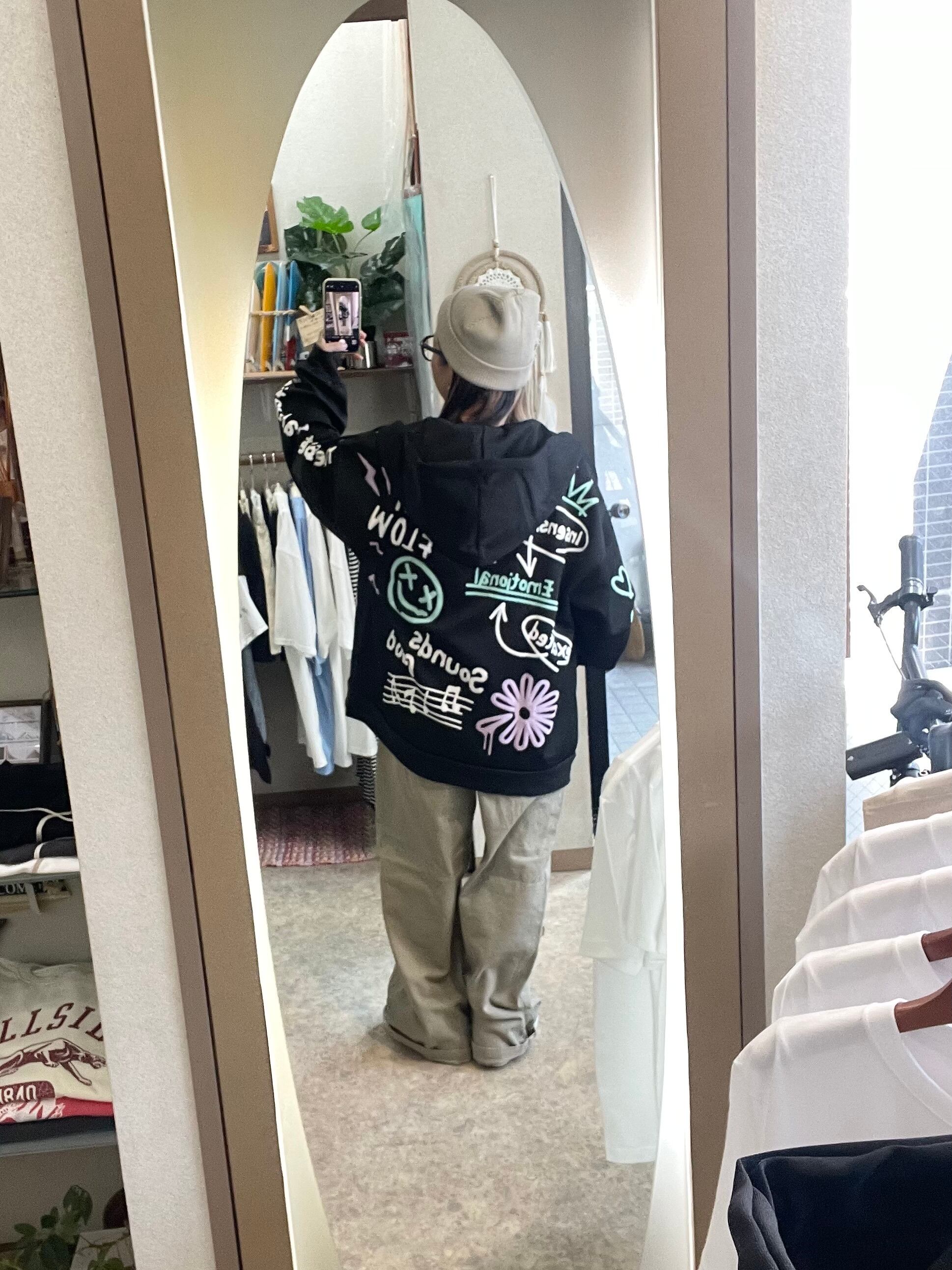 ご好評のラフガキ柄の刺繍風に見える発泡プリントで描かれたグラフィックは存在感抜群です。
