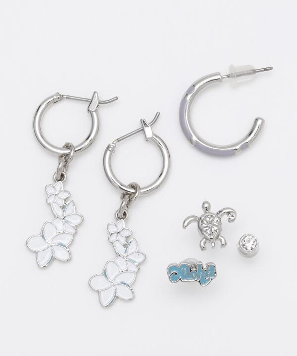ハワイでは身に着ける人の魅力を引き出すと云われている、プルメリアがモチーフの6点セットピアス。alohaの文字や小さなホヌが、あなたをハワイ気分にいざないます。