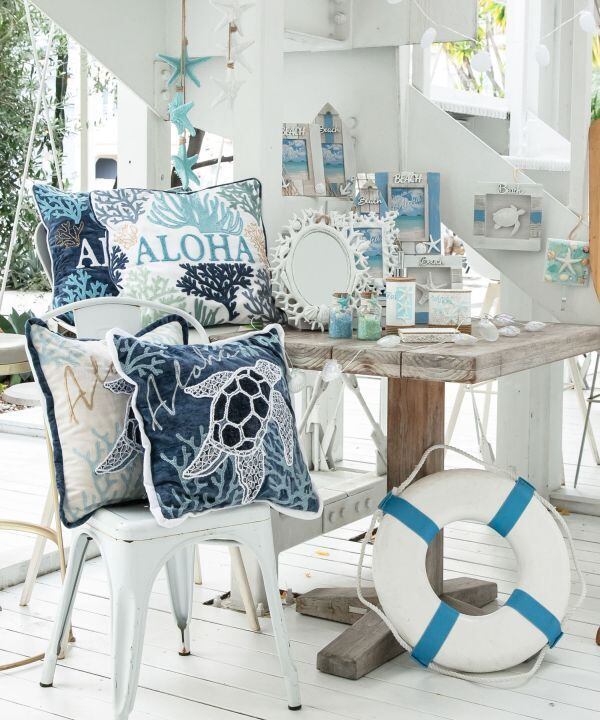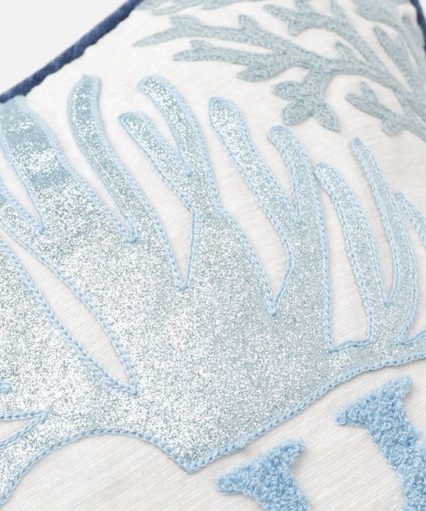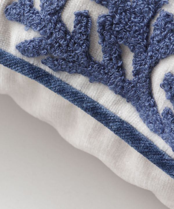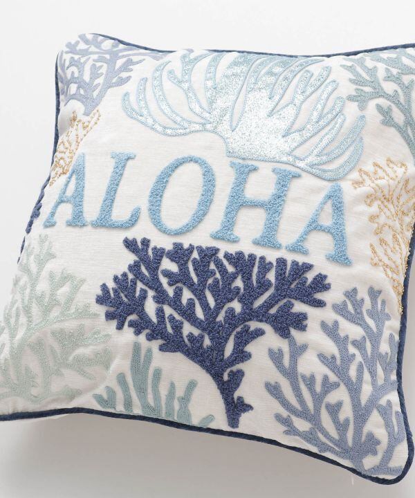 様々なテクニックの刺しゅうが施されたクッションカバー。ハワイのホテルにありそうな高級感で、お部屋のアクセントに最適です。上品なオーシャンデザインでお家時間を贅沢に彩ります。