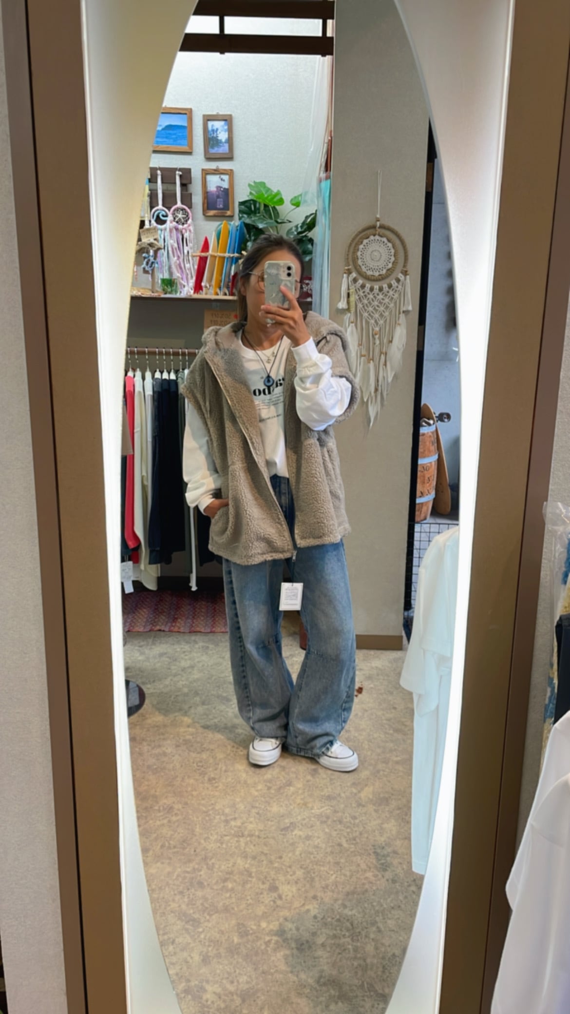 もこもことした表情が特徴的なボア素材を使用した、季節感あふれるフーディーベスト。