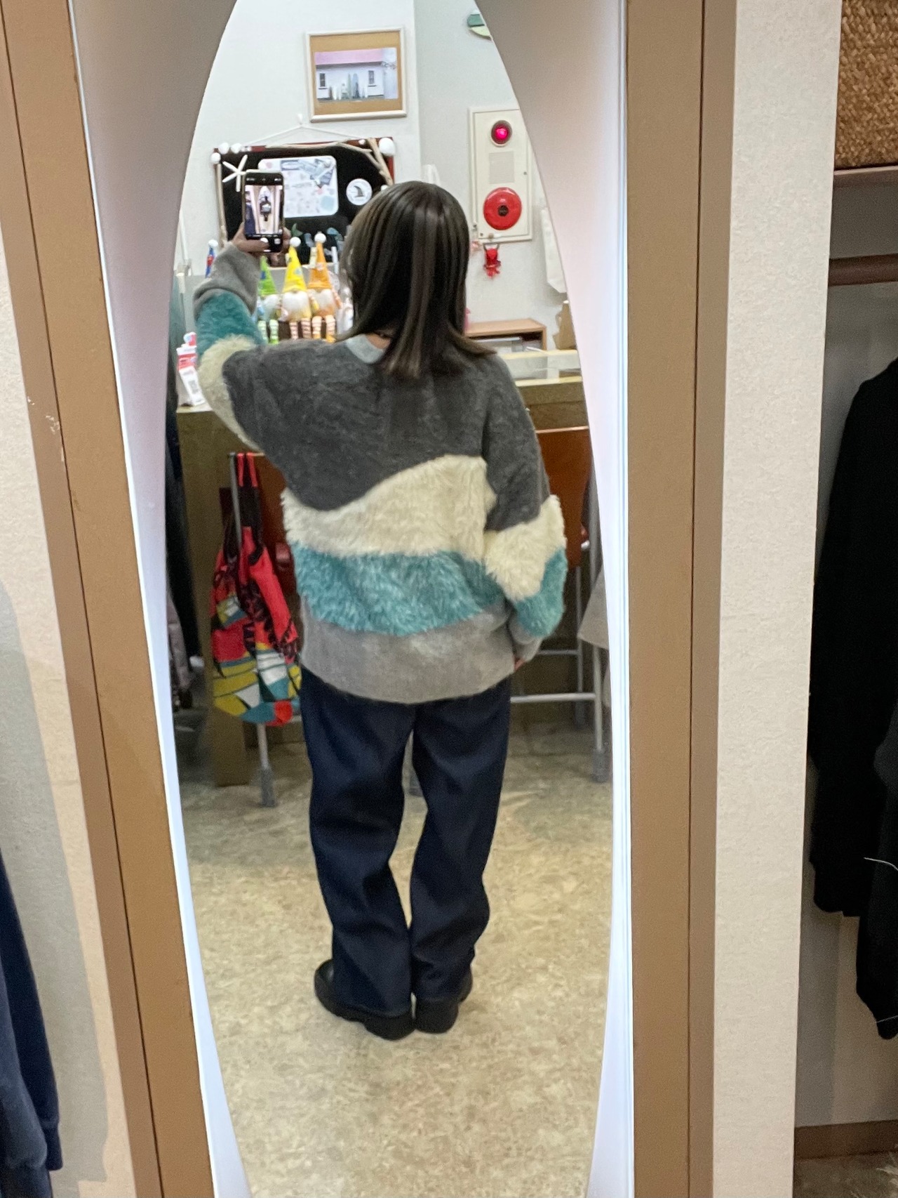 スカートと合わせれば、ふんわり感を活かしたフェミニンなスタイリングにも対応可能です。中にシャツをレイヤードして襟元を覗かせたり、ロングコートのインナーとして配色を見せるようなコーディネートもおすすめです。
