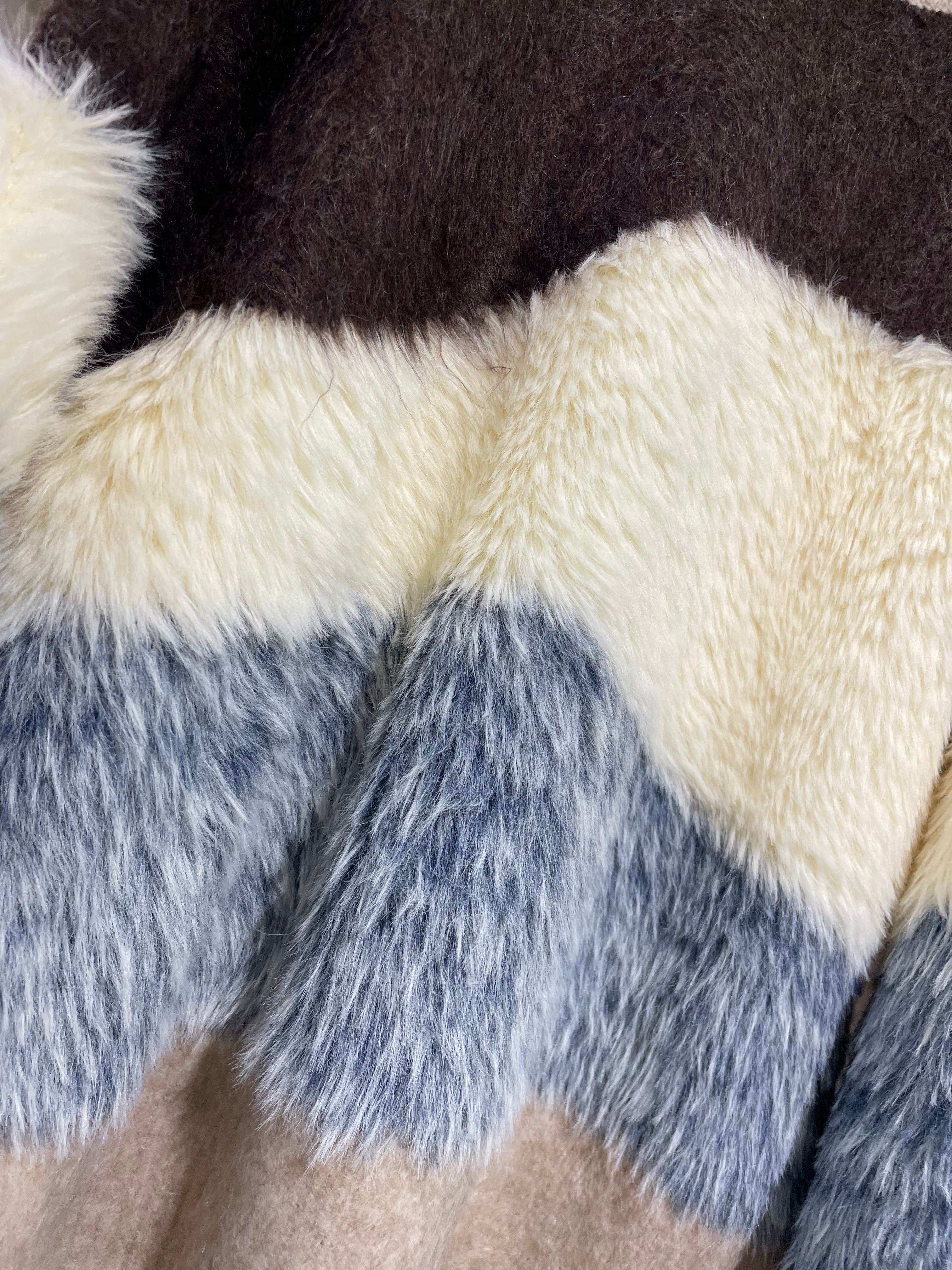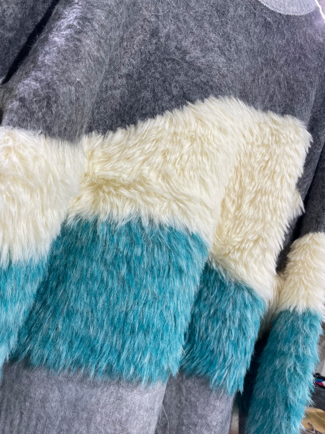目を惹くマーブル柄の大胆な切り替えと、毛足の異なる2種の糸を掛け合わせたインターシャ編みで、着映え感たっぷりに仕上げたニットプルオーバー。