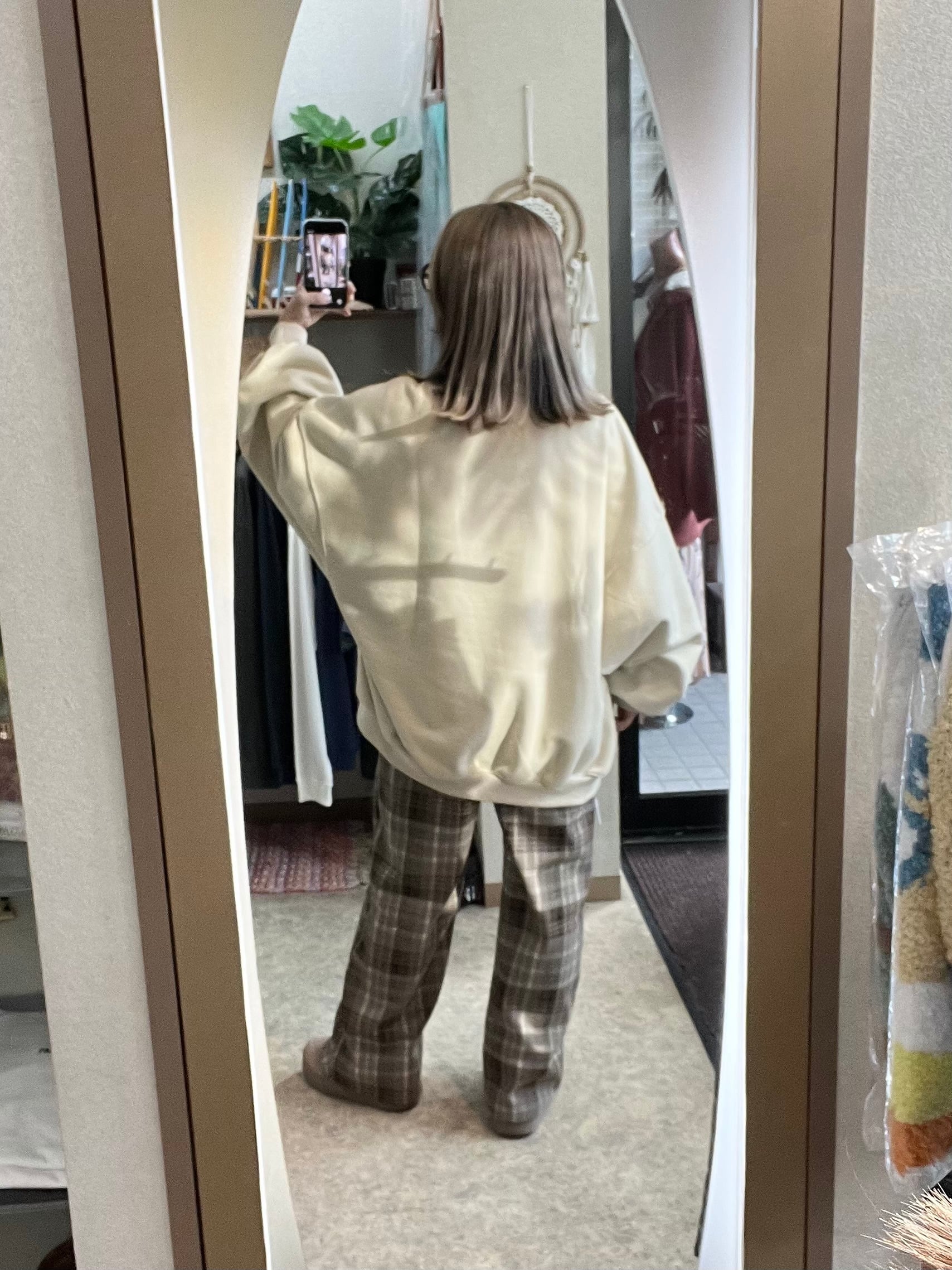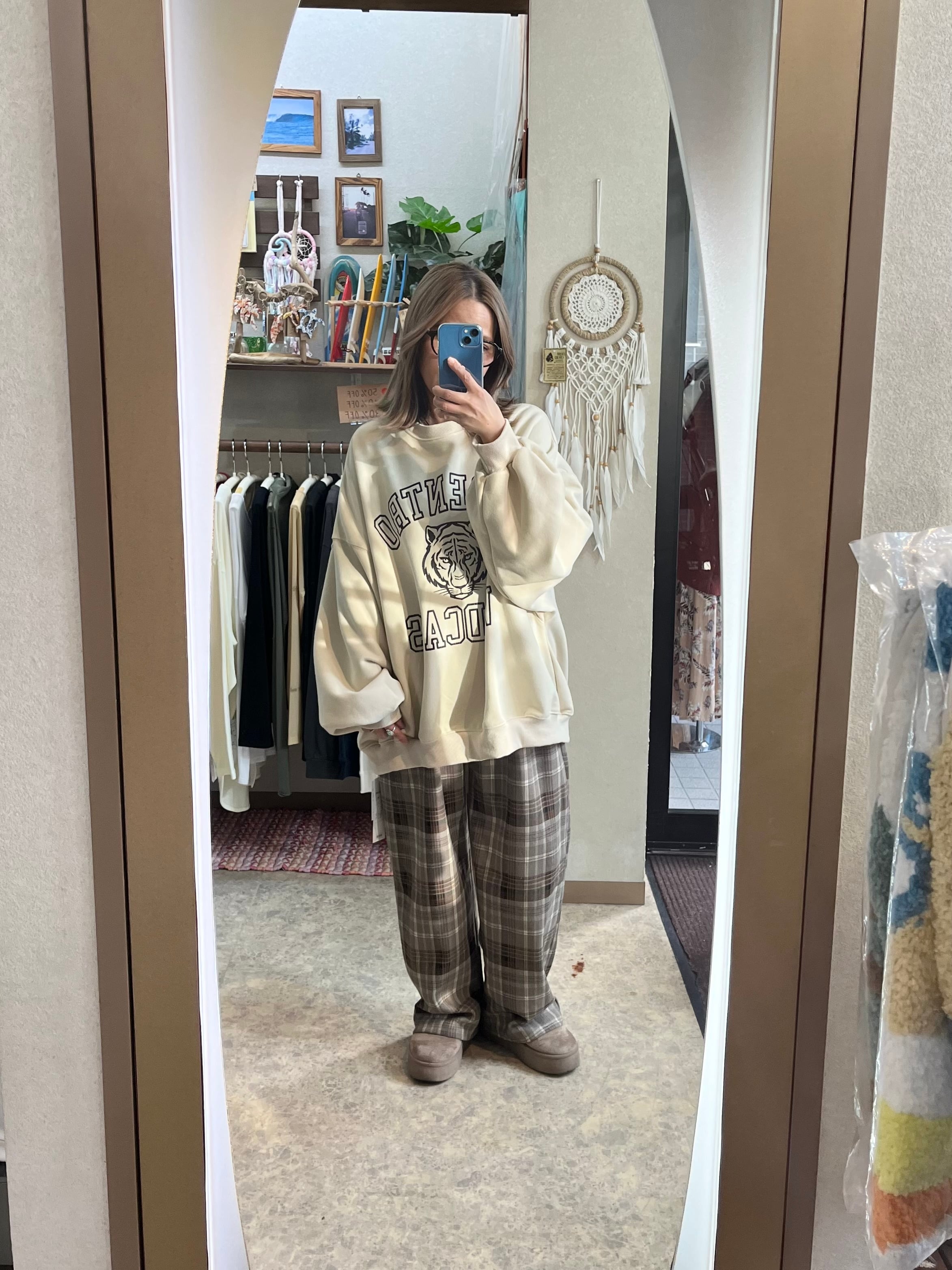 ルーズなシルエットが体型をカバーし、抜け感をプラス。