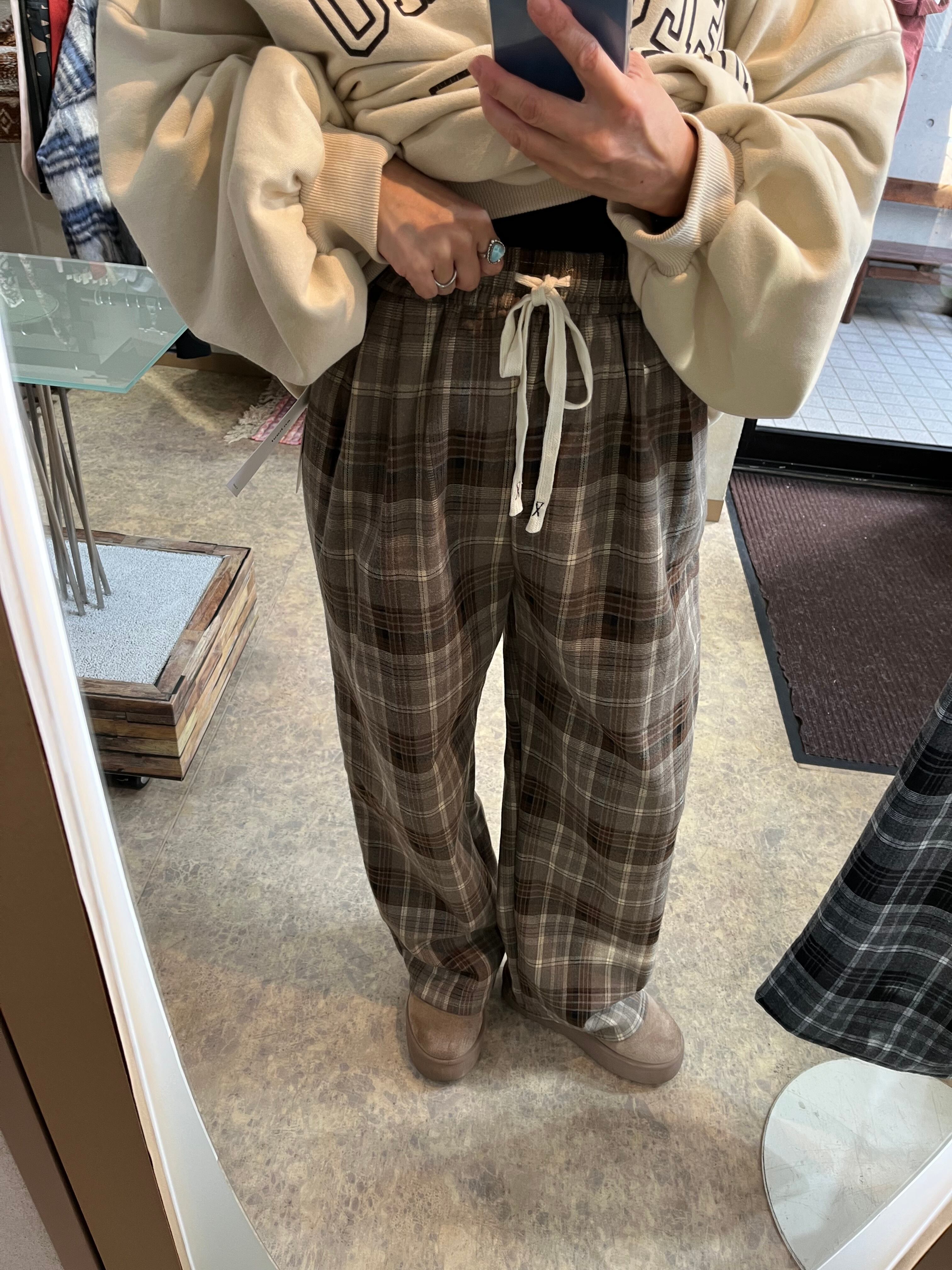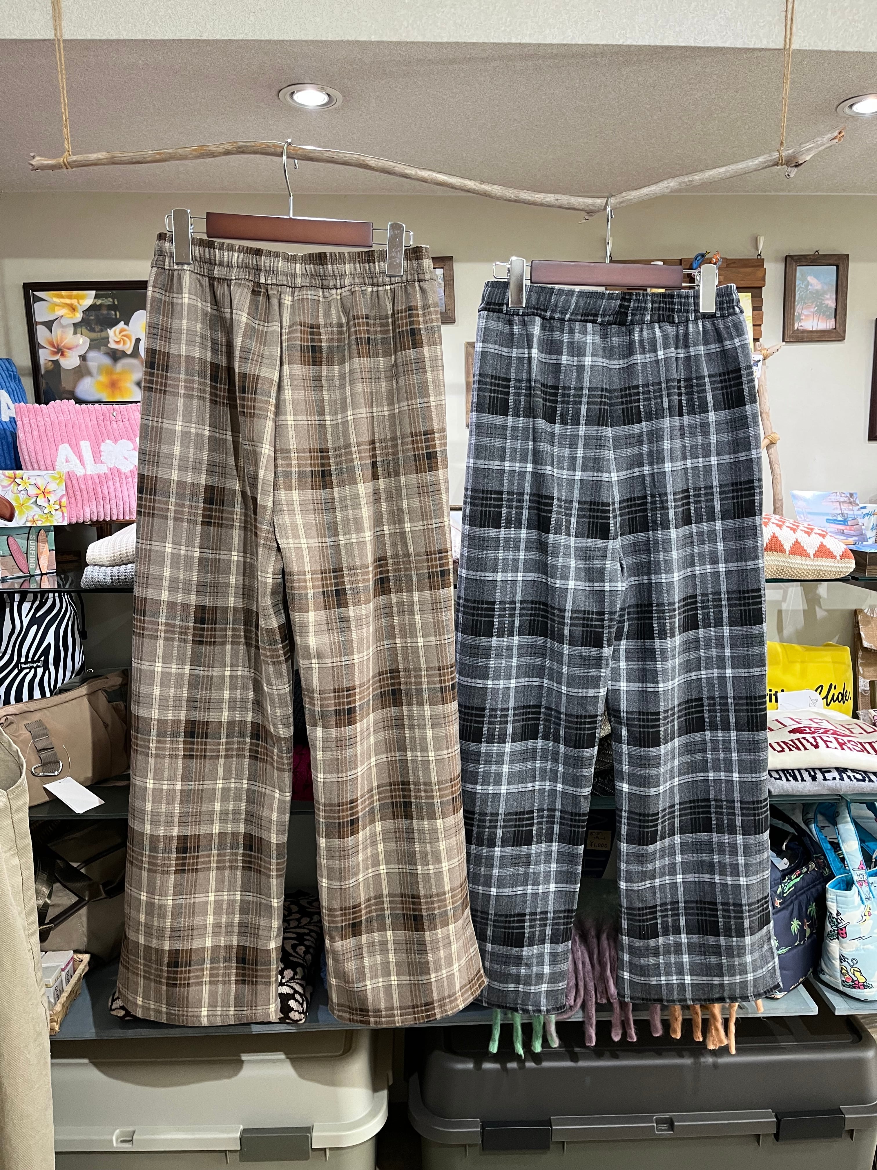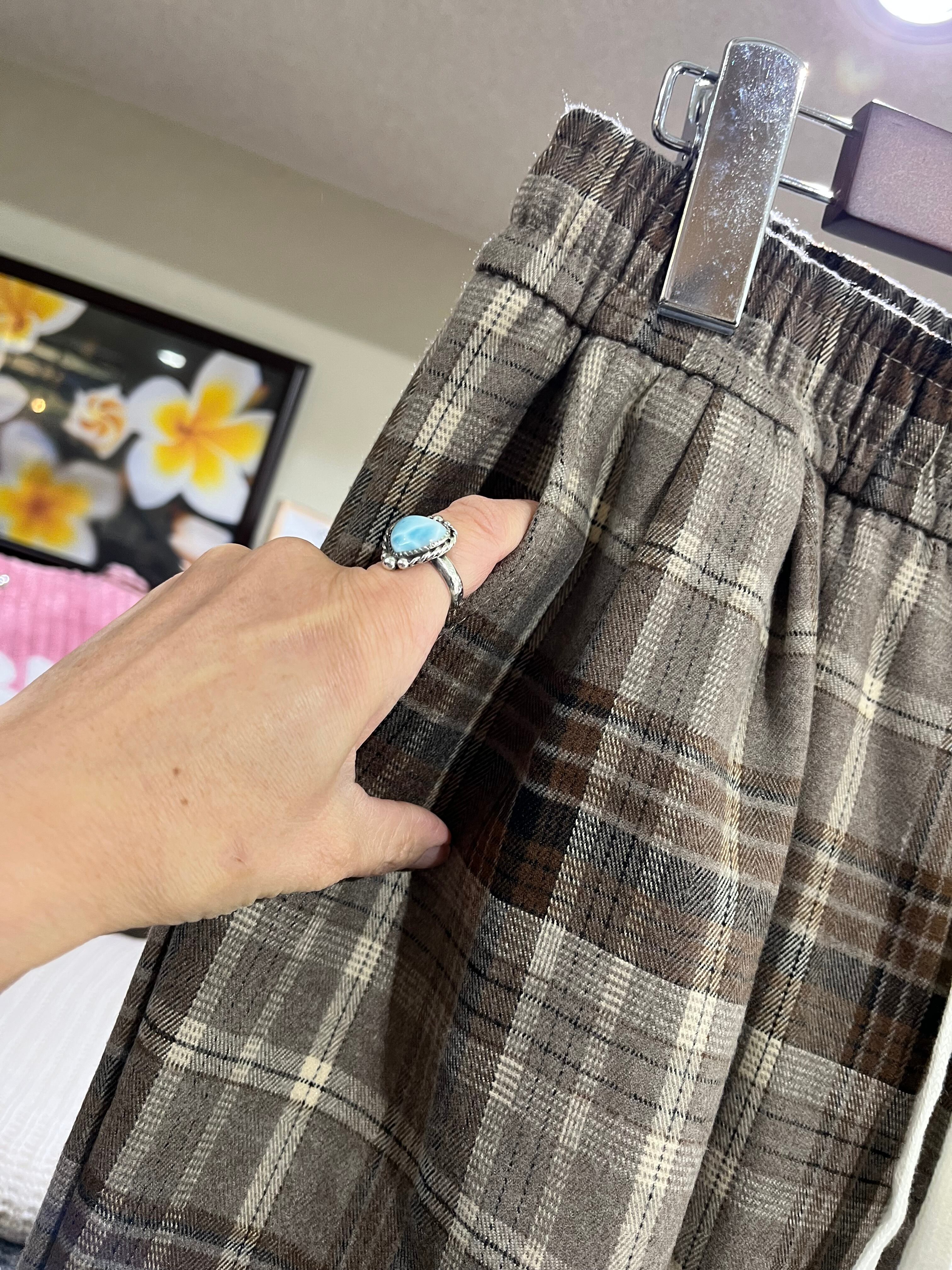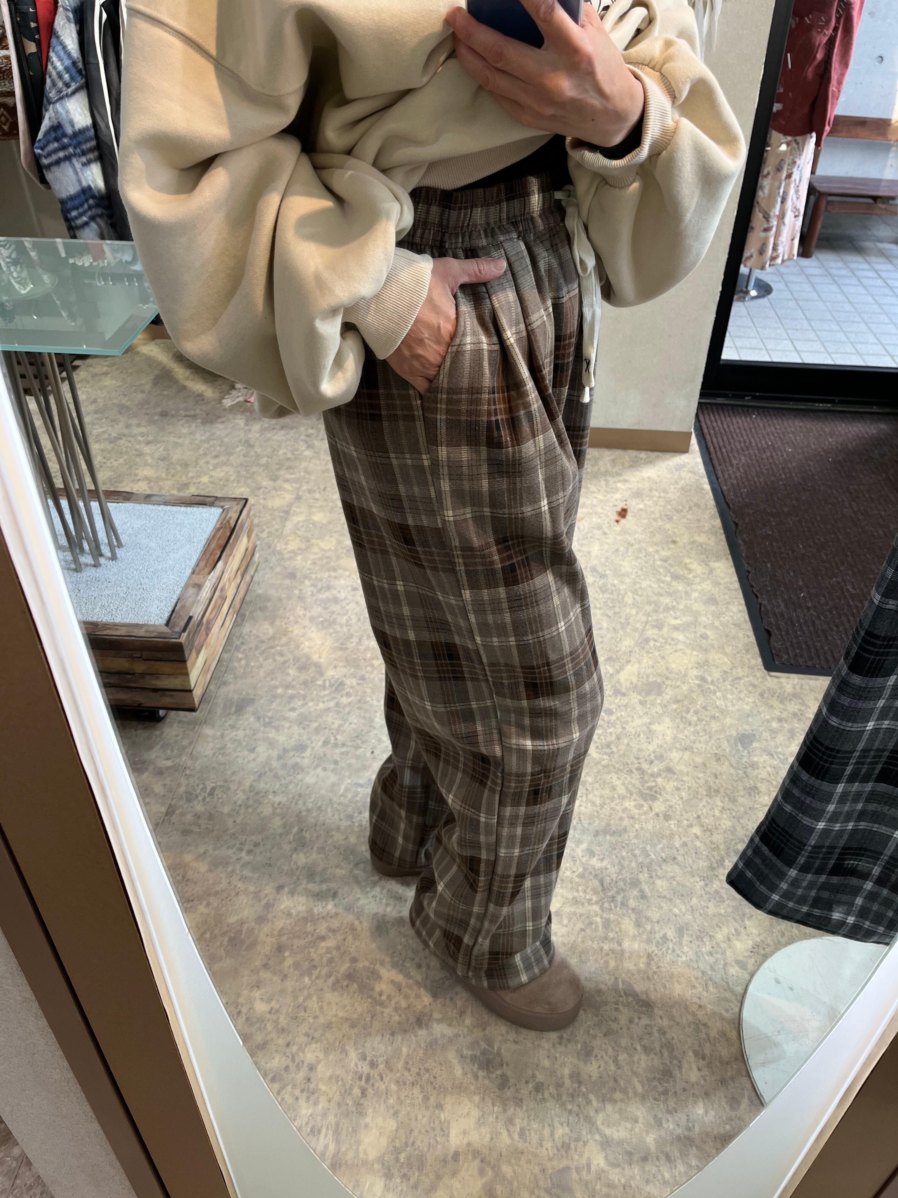 落ち着いたカラーのチェック柄が映える大人なワイドパンツ。