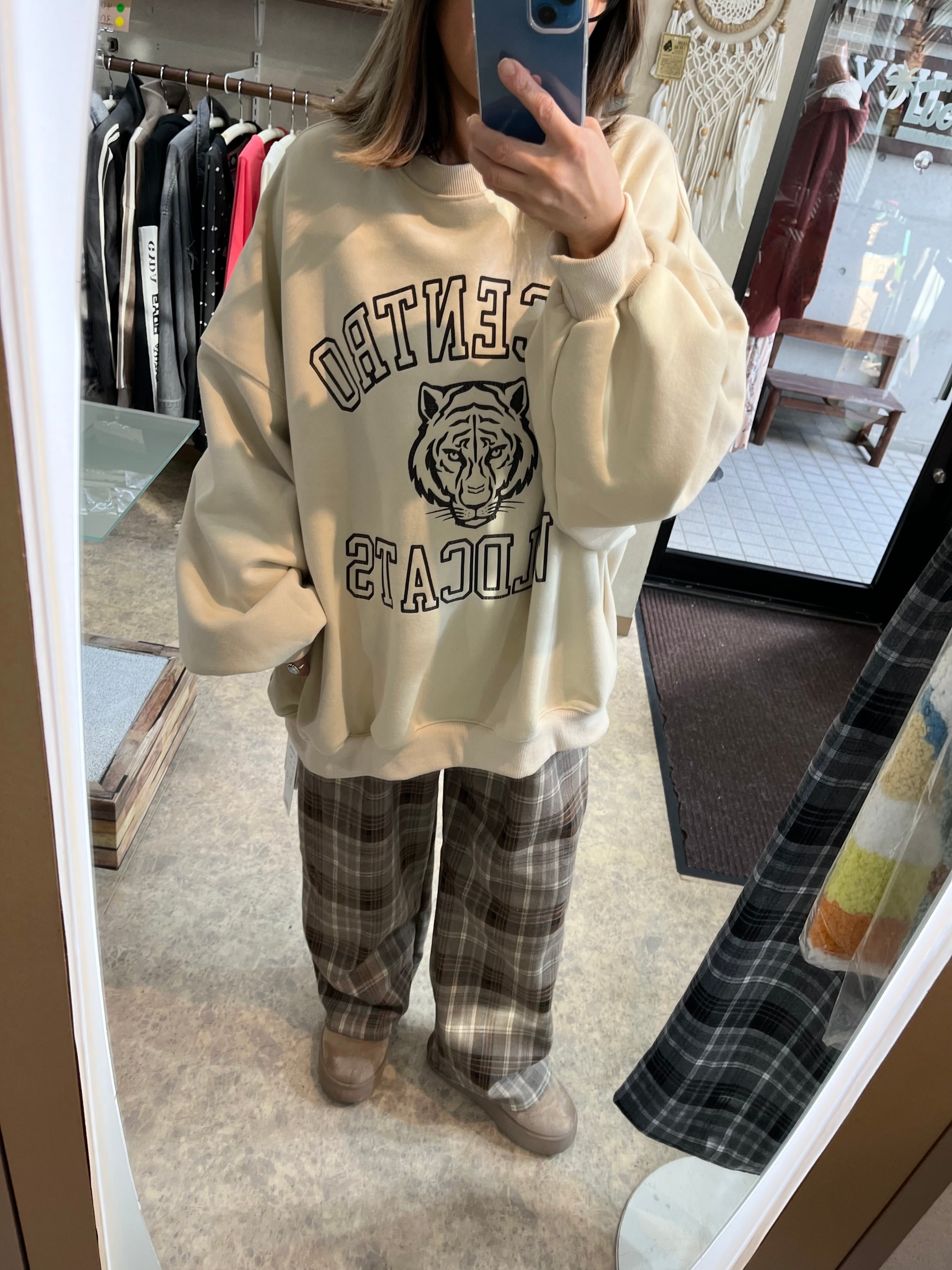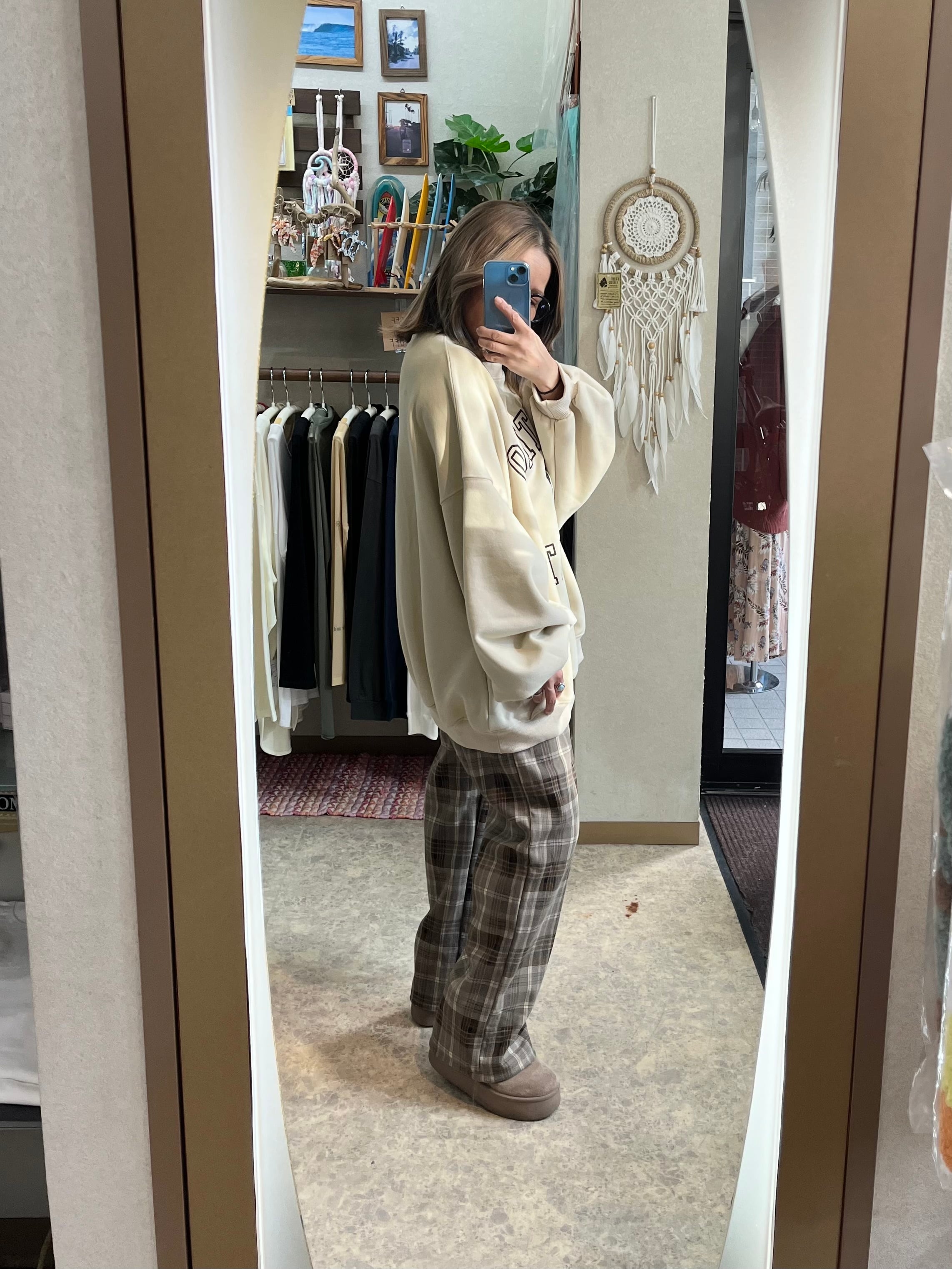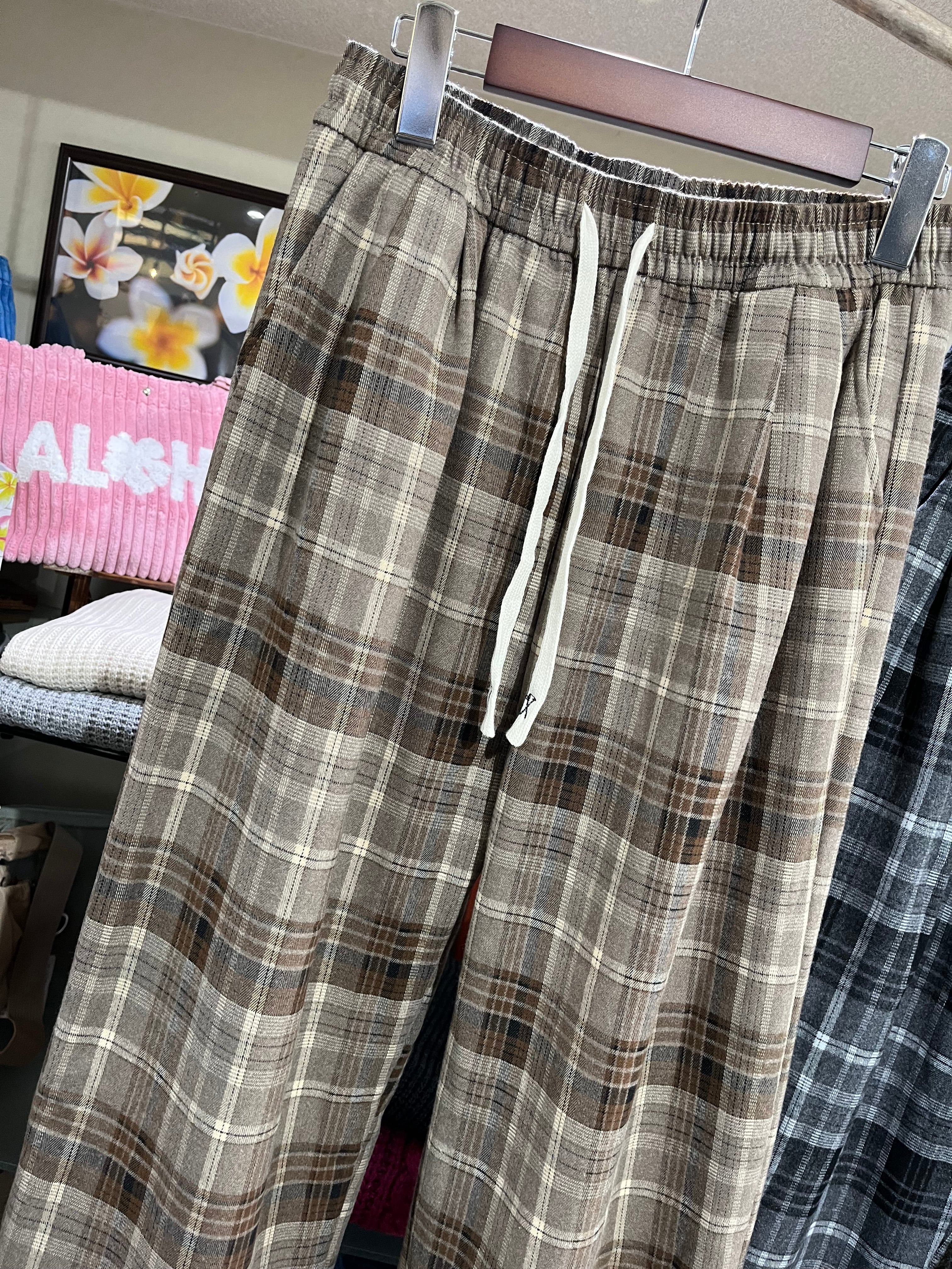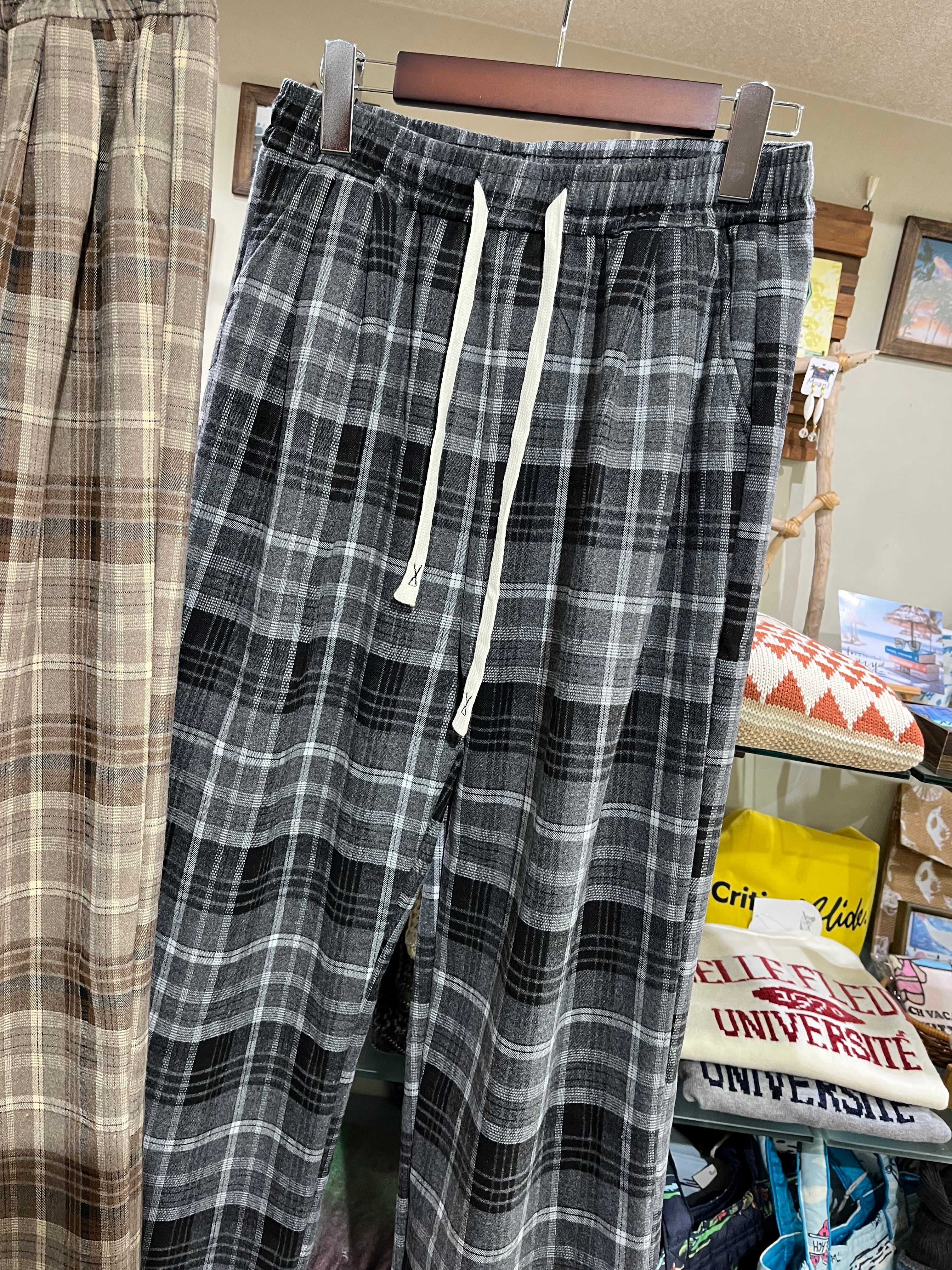 落ち着いたカラーのチェック柄が映える大人なワイドパンツ。