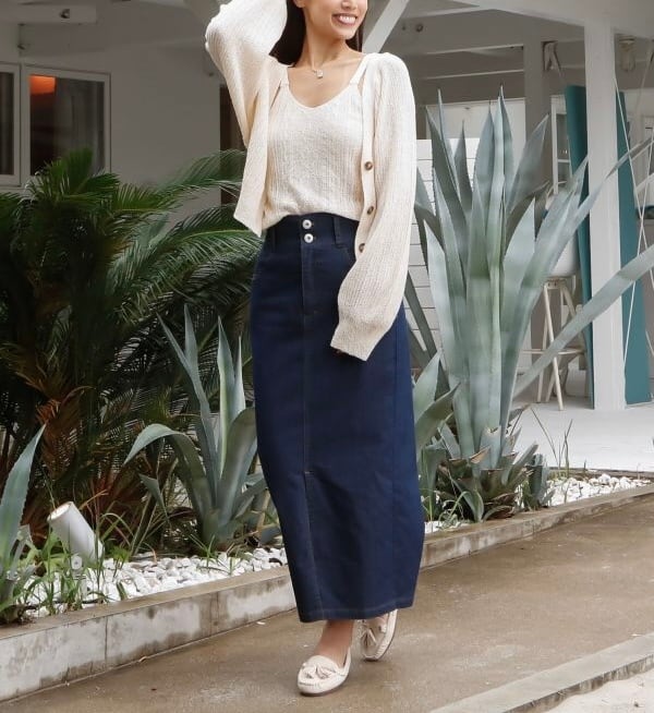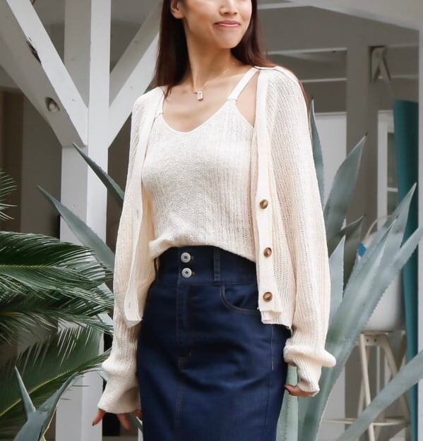 キャミソールは前中心の編み柄がポイントで、季節を問わず着回せるアイテムです。