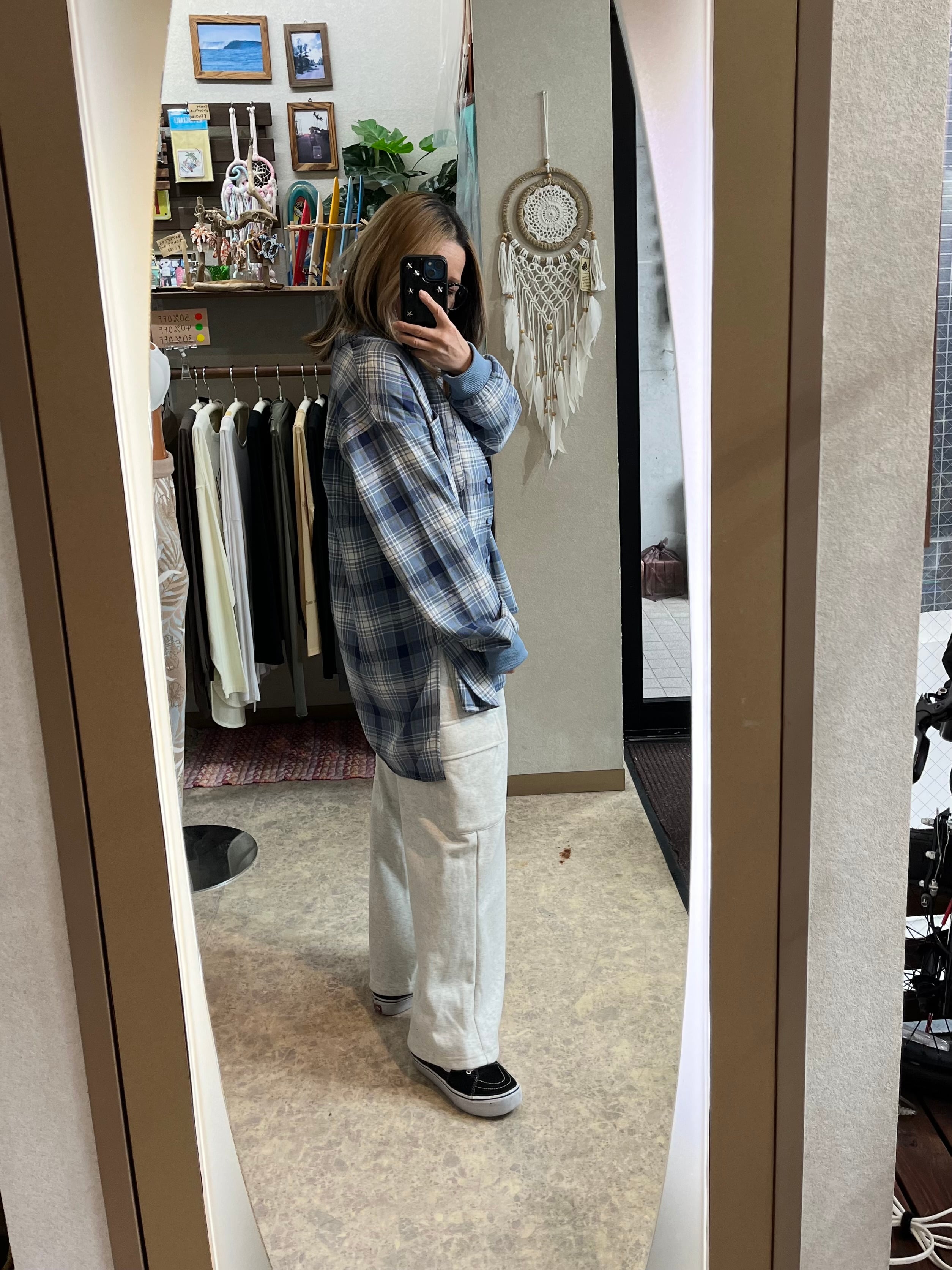 後ろポケットには波の刺しゅうが施され、さりげないアクセントに。