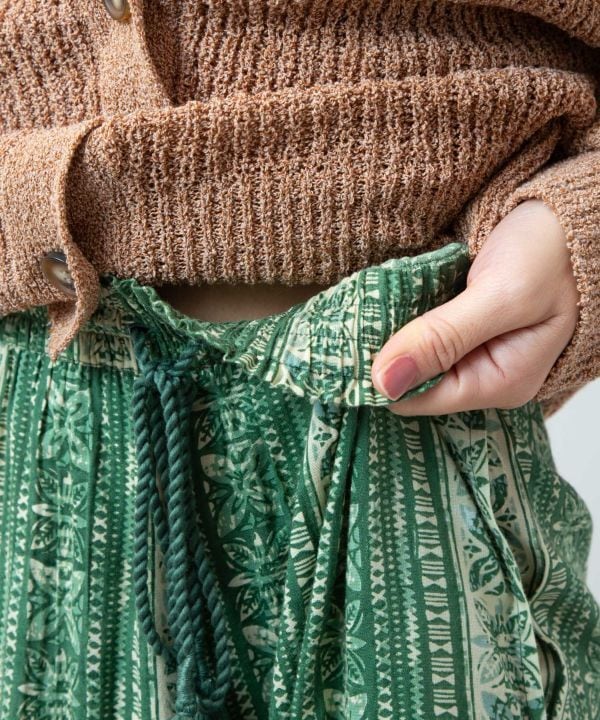 ウエスト紐のタッセルがポイントで、両サイドにはポケット付き。