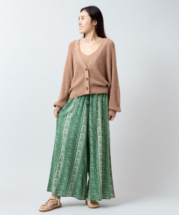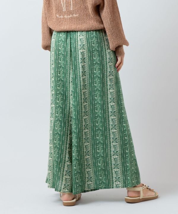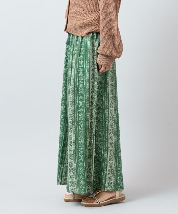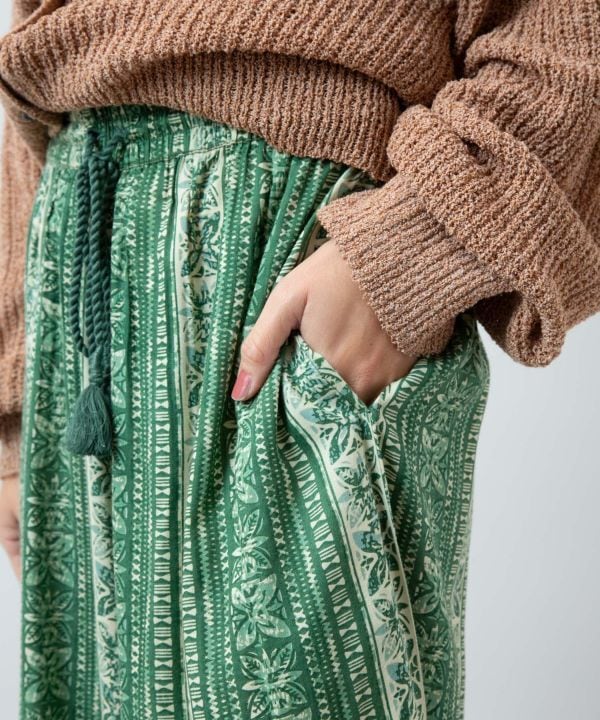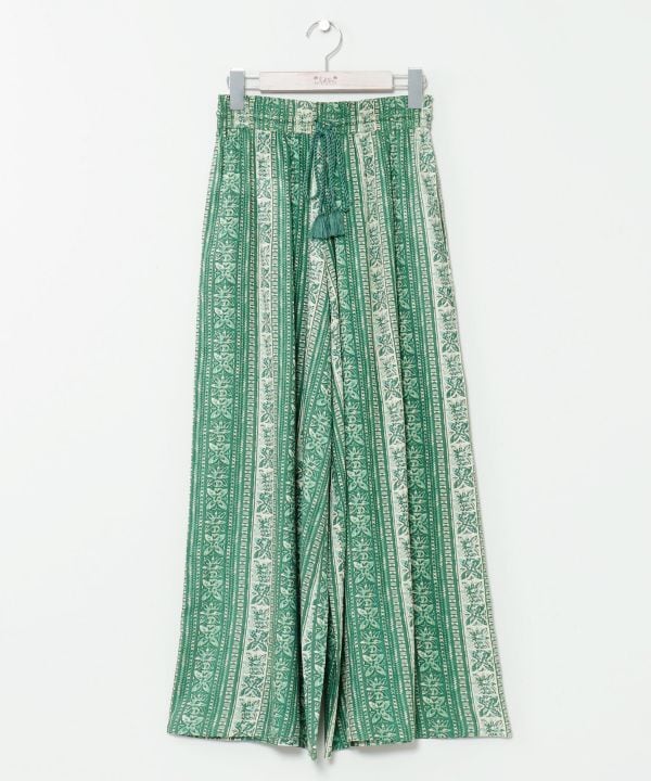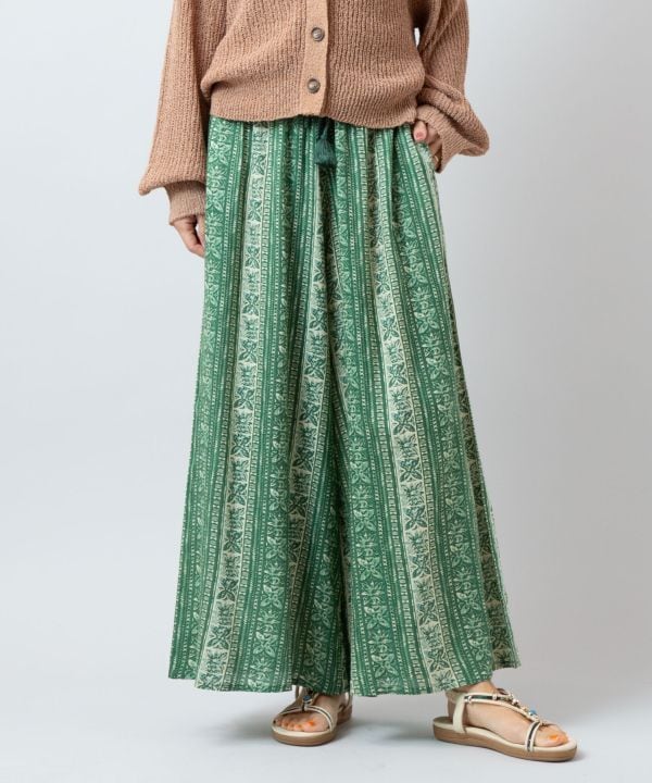 タパモチーフのプリントが印象的なフレアパンツ。