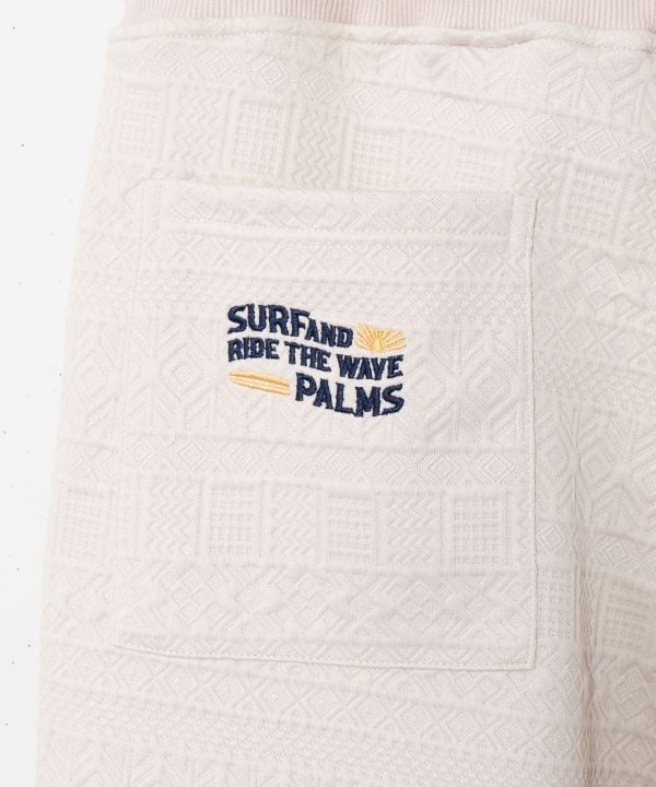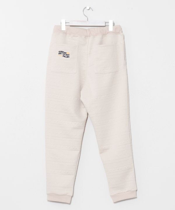 ストレッチ性のあるふくれジャカード素材を使用したユニセックスサイズのパンツ。