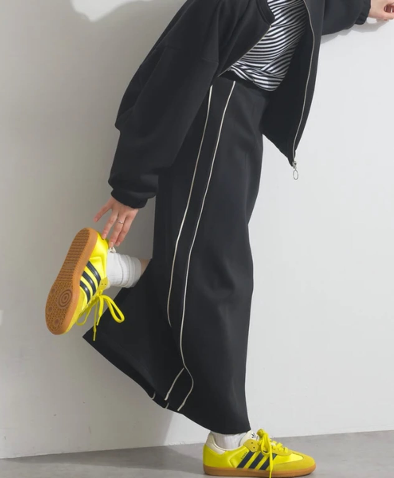 配色デザインのサイドラインがアクセントとなり、トレンド感のあるスポーティなムードをプラス。
