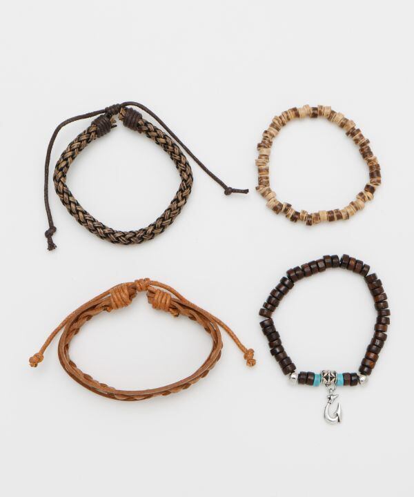 レザーやココナッツウッドを組み合わせた4本セットのメンズブレスレット。
