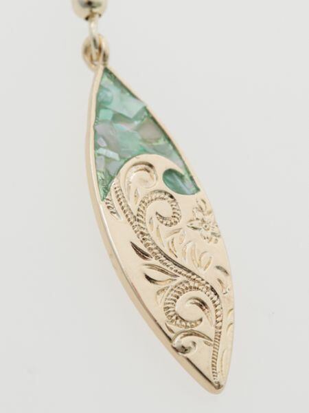 ハワイアンジュエリー調の刻印が施されたウェーブ型のメタルと、水面を思わせるシェルフレークのピアス。