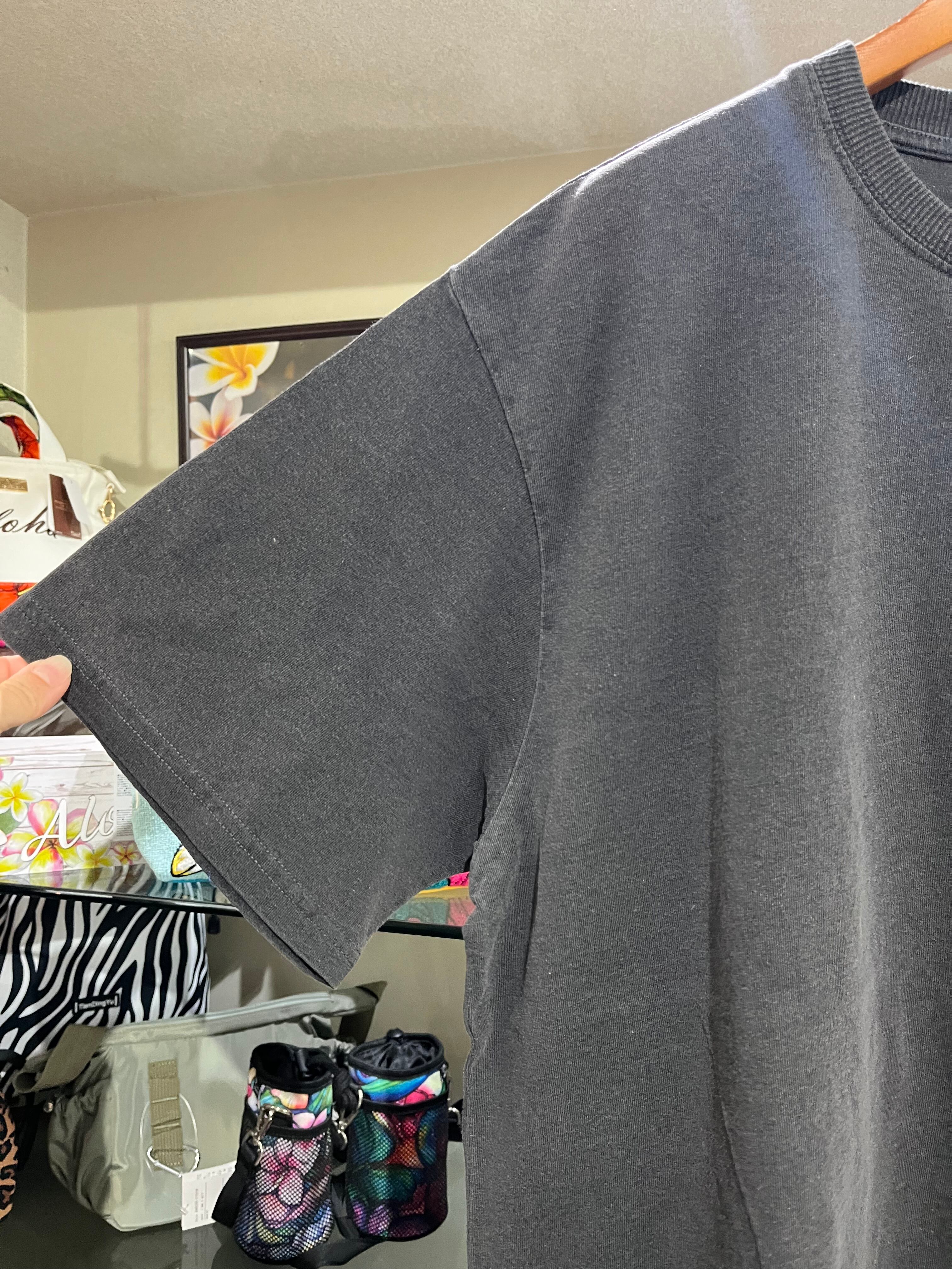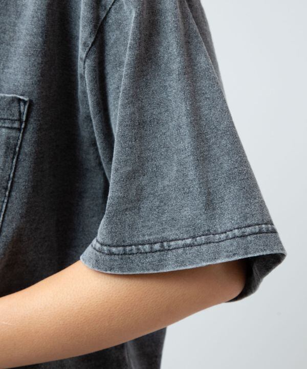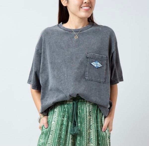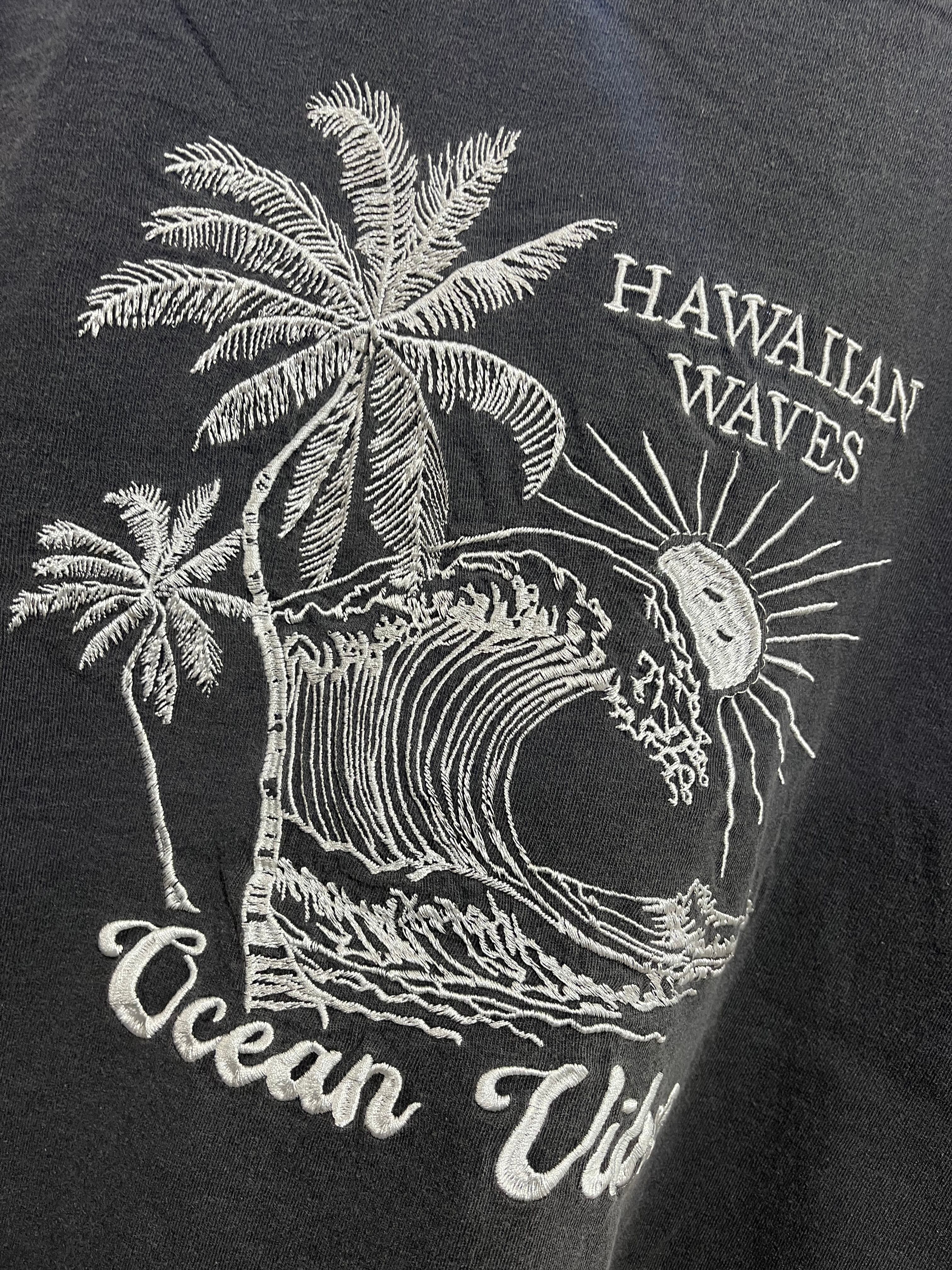 デニム風の洗い加工が施されたメンズTシャツ。背中にはヤシの木と波を描いた刺しゅうが施され、胸ポケットにはワッペンがアクセントに。カジュアルながらもハワイの海を感じさせるデザインで、デニムやショートパンツとの相性も抜群。ほどよい厚みの生地で一枚でも快適に着こなせるアイテムです。製品洗いのため色合いに個体差があります。