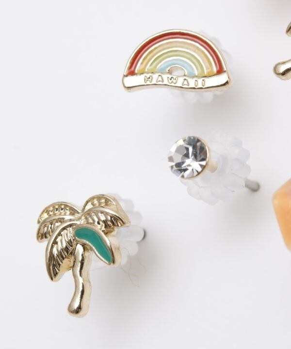 HAWAIIでは守護や家族愛という意味が込められた、パームツリーモチーフの6個セットピアス。セットのトロピカルカラーのストーンピアスやレインボーモチーフと組合わせて、顔周りを明るい印象に。