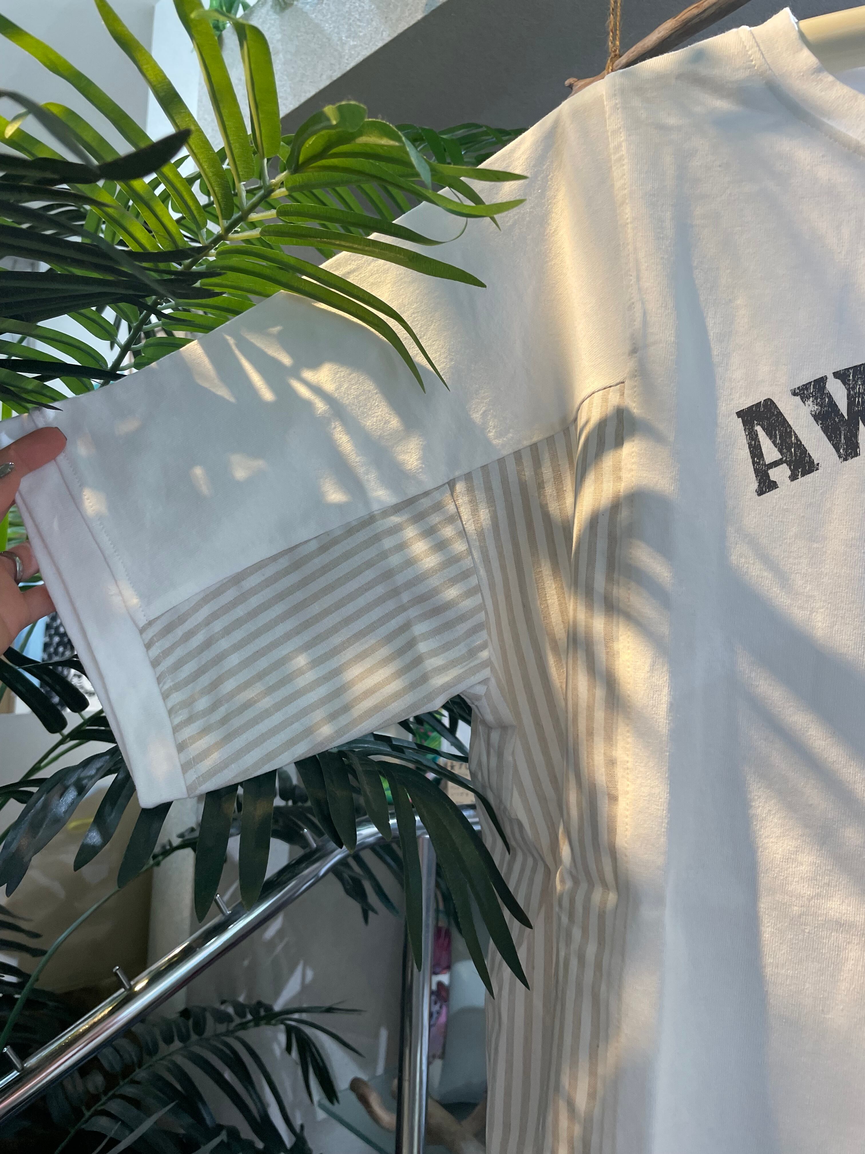 アメリカンテイストなロゴとストライプ生地がポイントです。