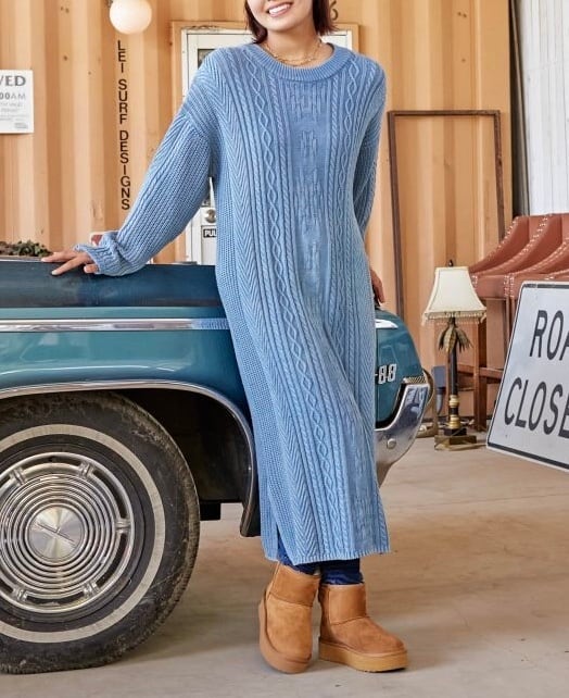 洗い加工が施された、やわらかく着心地のいい綿素材のニットワンピース 。