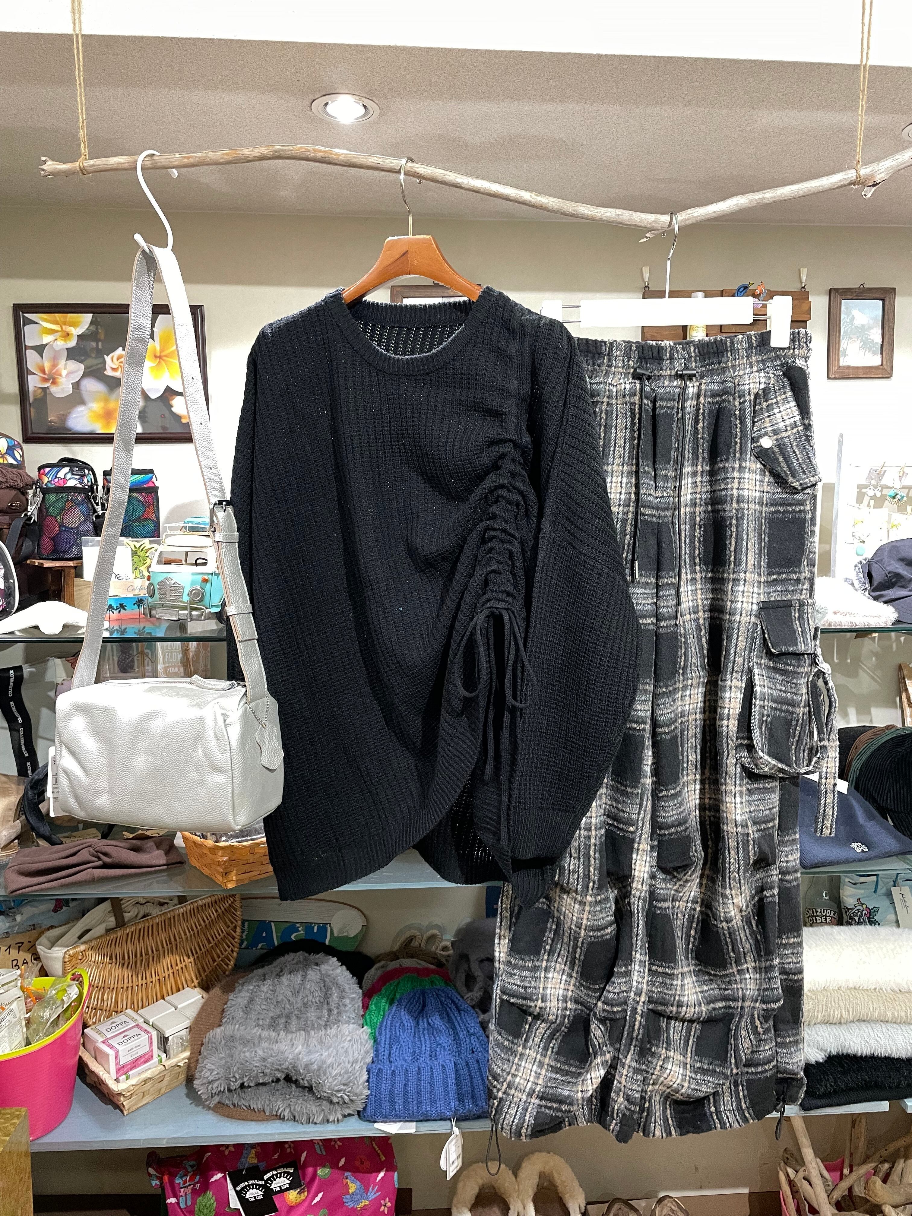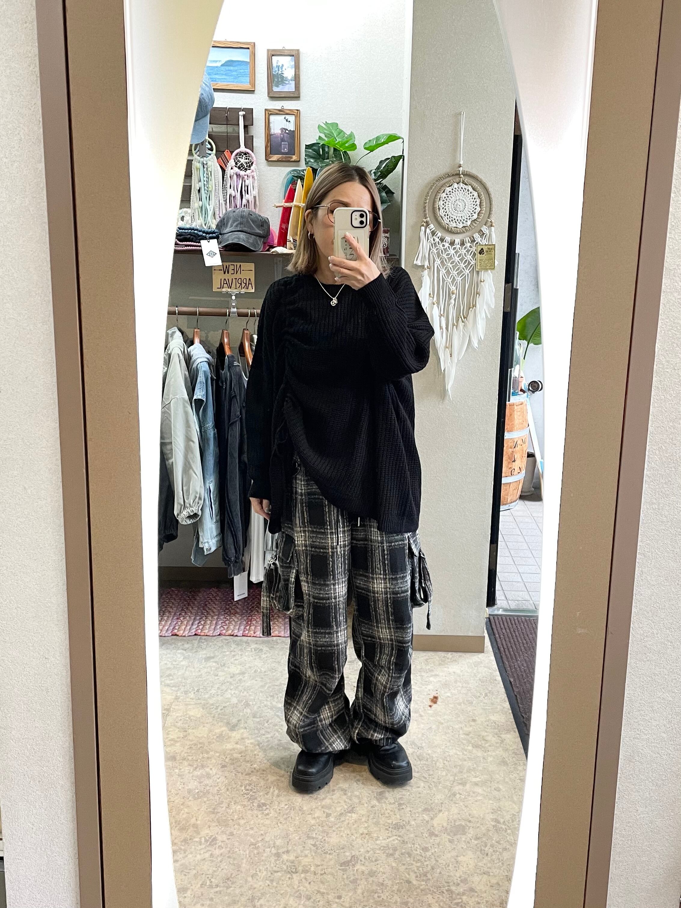 ワイドなニットで、身幅がゆったりとしており体のラインを拾いにくいため、Mサイズと記載していますが他のサイズの方でもお召いただけるサイズ感です。